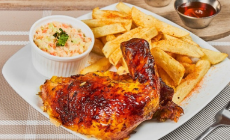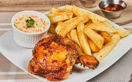 Combo de pechuga y ala de pollo asadas, acompañadas de papas a la francesa y ensalada fresca.