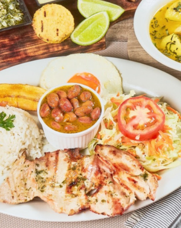 Pechuga de pollo a la plancha, acompañada de sopa, arroz, frijol, huevo frito, tajada de maduro, ensalada y jugo del día.