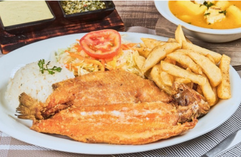 Filete de tilapia fresca frita, acompañado de arroz, papas a la francesa, ensalada y tajada de maduro.