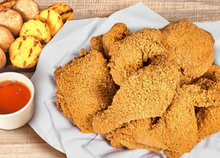Combo de pechuga y ala de pollo apanadas, servidas con papas a la francesa y ensalada fresca.