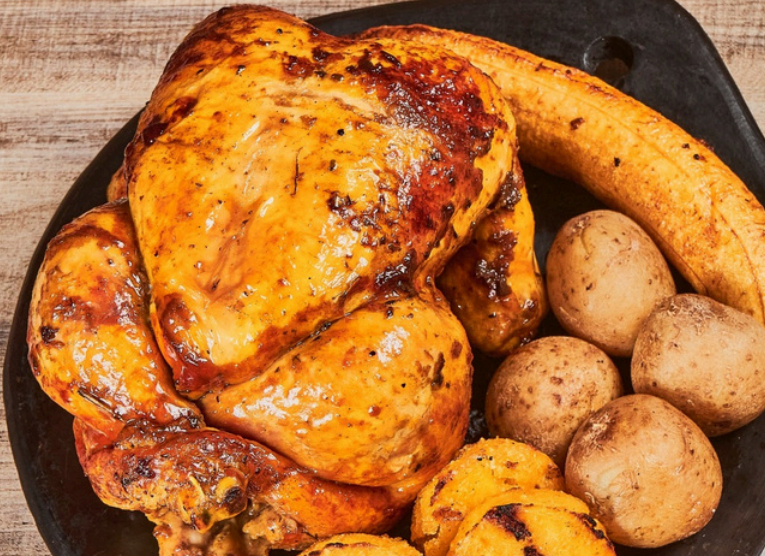 Pollo entero asado al carbón, acompañado de papas, arepas y maduro.