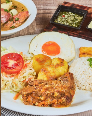 Sobre barriga sudada, servida con sopa, arroz, frijol, huevo frito, tajada de maduro, ensalada y jugo del día.