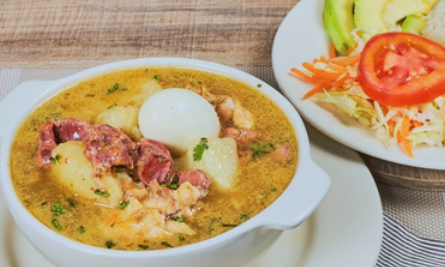Caldo casero de menudencias de pollo, servido en horario de 10 a 12, opción especial con arroz, ensalada, tajada y jugo.