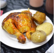 Combo de muslo y contra muslo de pollo asado, acompañado de papas a la francesa y ensalada fresca.