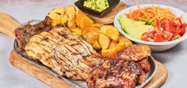 Combinación especial de res, cerdo, pollo y chorizo a la parrilla, con papas a la francesa, arepa con queso y ensalada fresca.