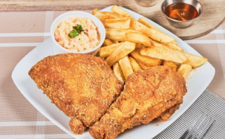 Contra muslo de pollo apanado, servido con papas a la francesa y ensalada fresca.