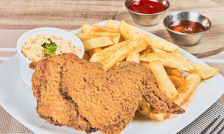 Ala de pollo apanada, servida con papas a la francesa y ensalada fresca.