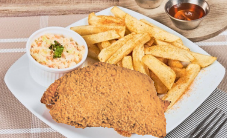 Pechuga de pollo apanada, acompañada de papas a la francesa y ensalada fresca.