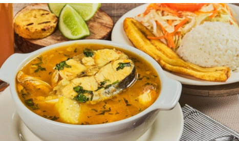 Caldo tradicional de pescado con especias, disponible en horario de 10 a 12, opción especial con arroz, ensalada, tajada y jugo.