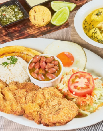 Pechuga de pollo apanada, acompañada de papas, arepas y maduro.