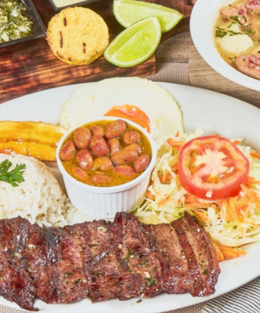 Carne de res asada, servida con sopa, arroz, frijol, huevo frito, tajada de maduro, ensalada y jugo del día.