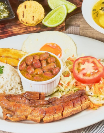 Chicharrón crocante acompañado de sopa, arroz, frijol, huevo frito, tajada de maduro, ensalada y jugo del día.