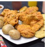 Ala de pollo apanada, acompañada de papas, arepas y maduro.
