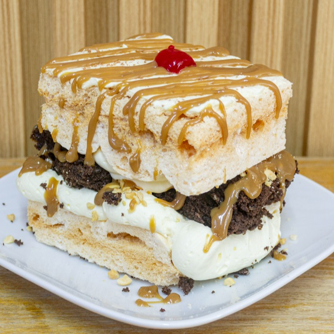 1 capa de merengue, 1 alfajor grande, 1 alfajor pequeño, crema batida y 1 fruta y 1 salsa a elección