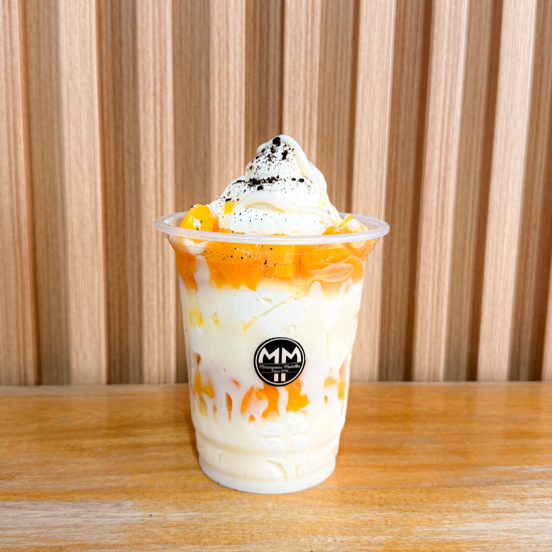 Crema batida, trozos de merengue, 1 fruta, 1 salsa y 4 suspiros de merengue saborizado
