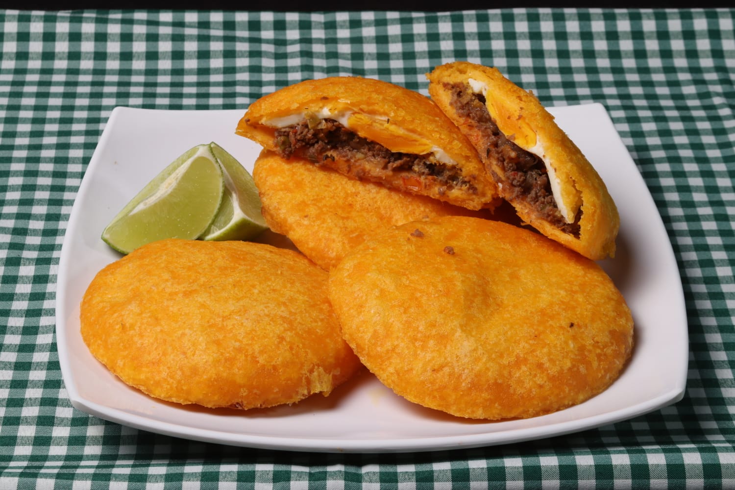 Arepa de maíz frita rellena de huevo y carne.