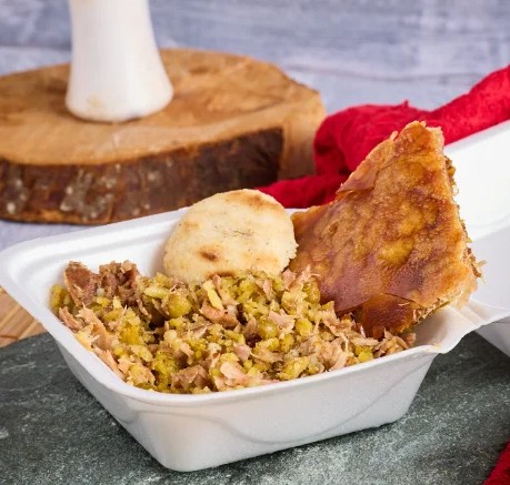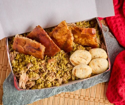 500 gramos de lechona mas garrita y 2 arepas para, perfecto para 2 personas