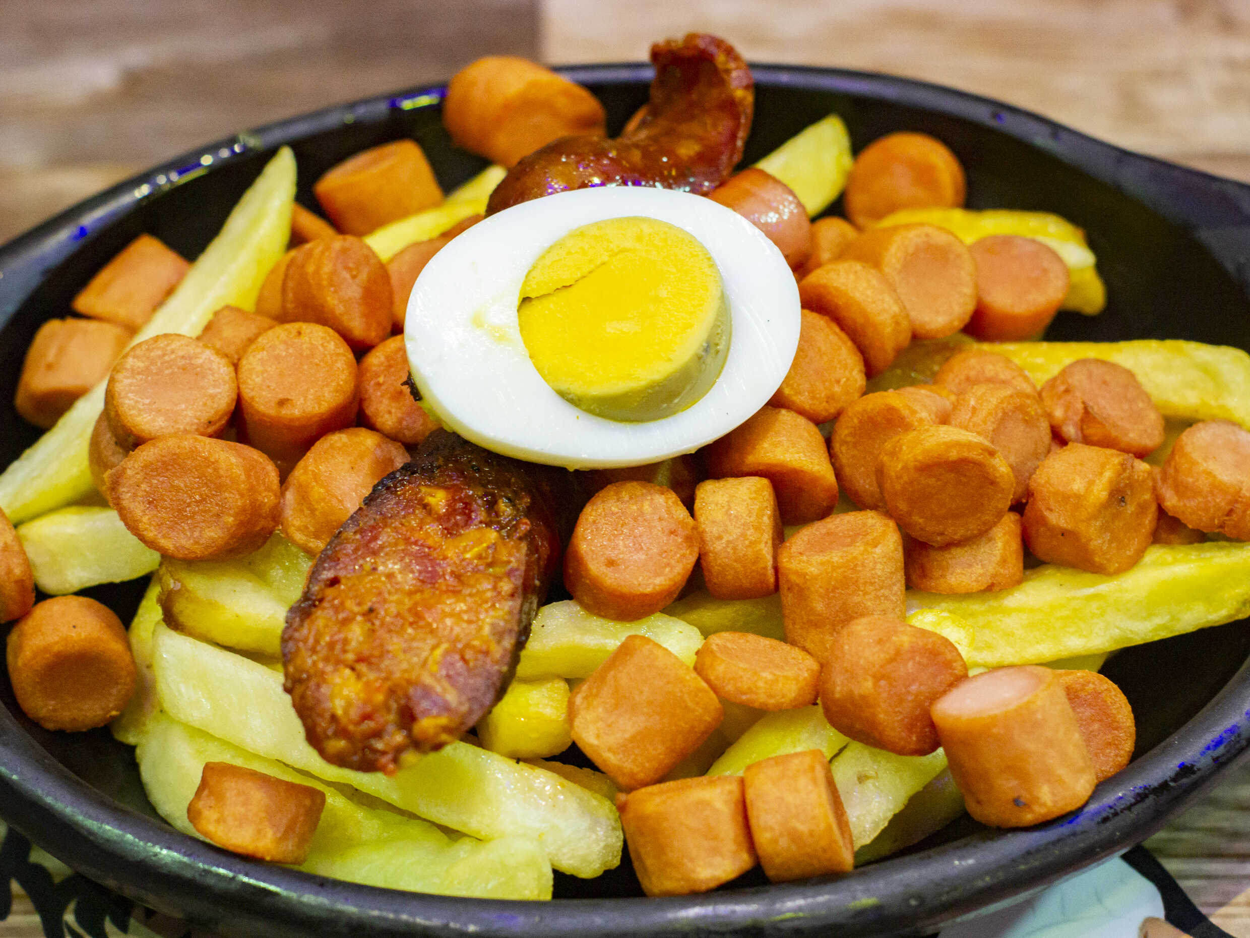 Papas a la francesa, acompañado de salchichas y huevos de codorniz.