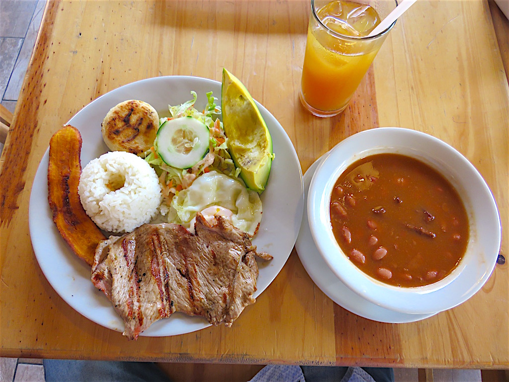 frijoles, chicharron, carne molida, maduro, ripio de papa, seco con arroz y ensalada, arepa y bebida
