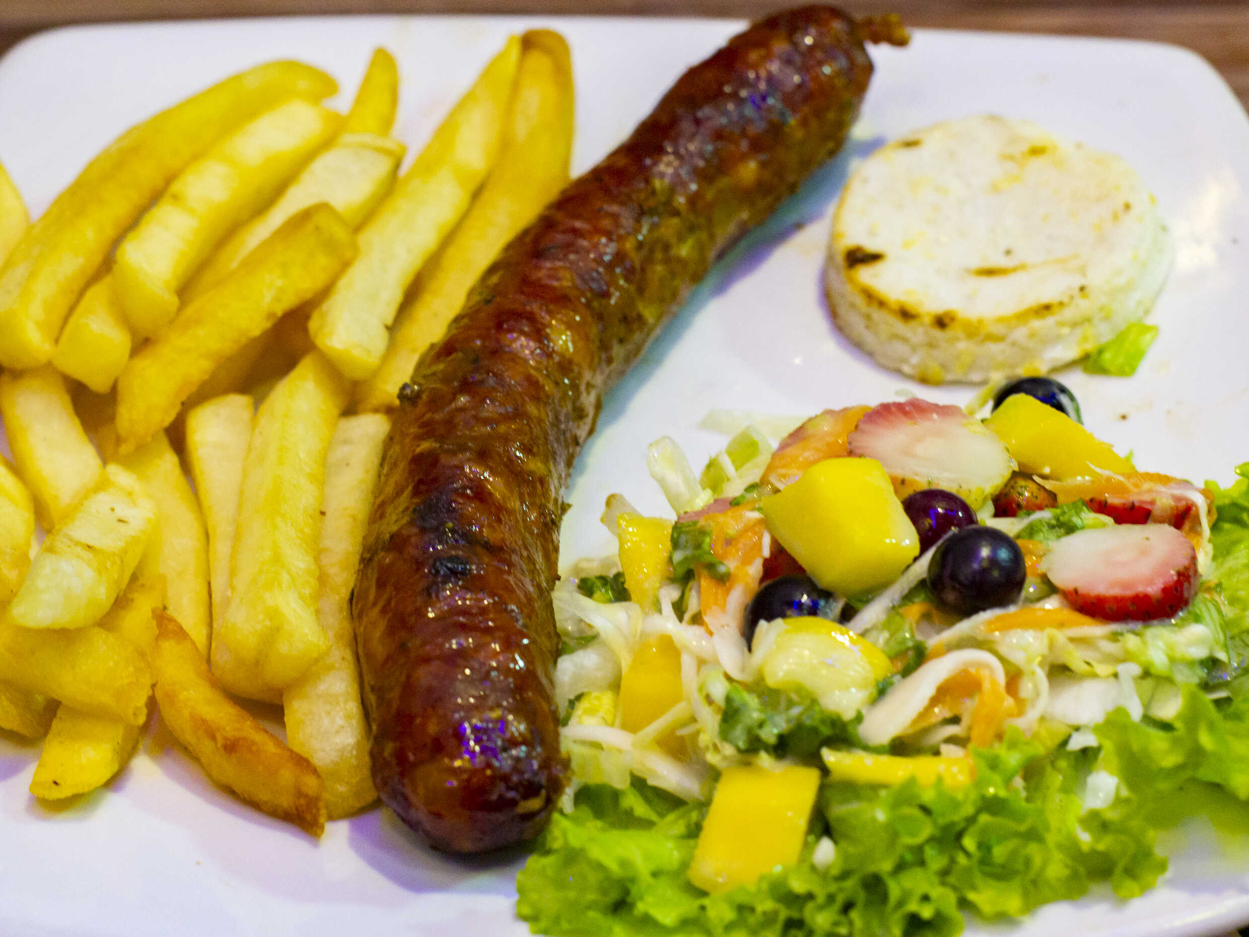 Chorizo artesanal, acompañado de papas a la francesa, ensalada de la casa y arepa.