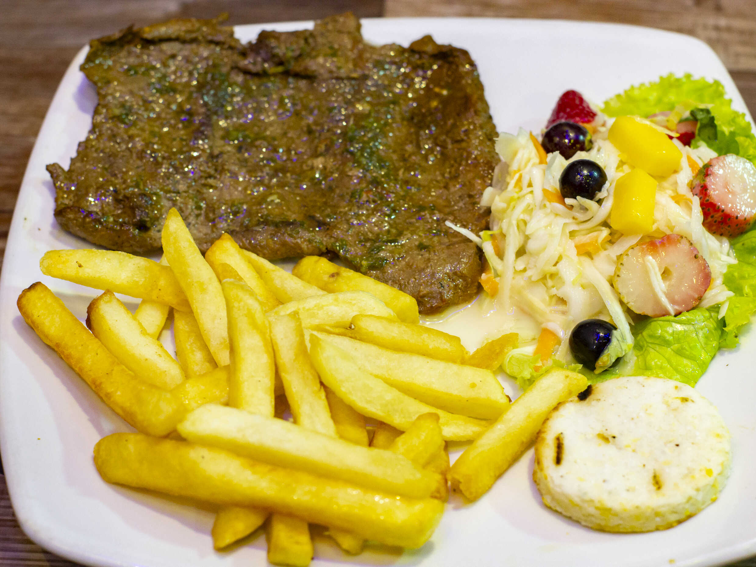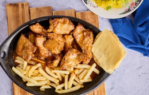 Corte de carne Cerdo de 250gr, acompañado de papas a la francesa, ensalada de la casa y arepa con queso.
