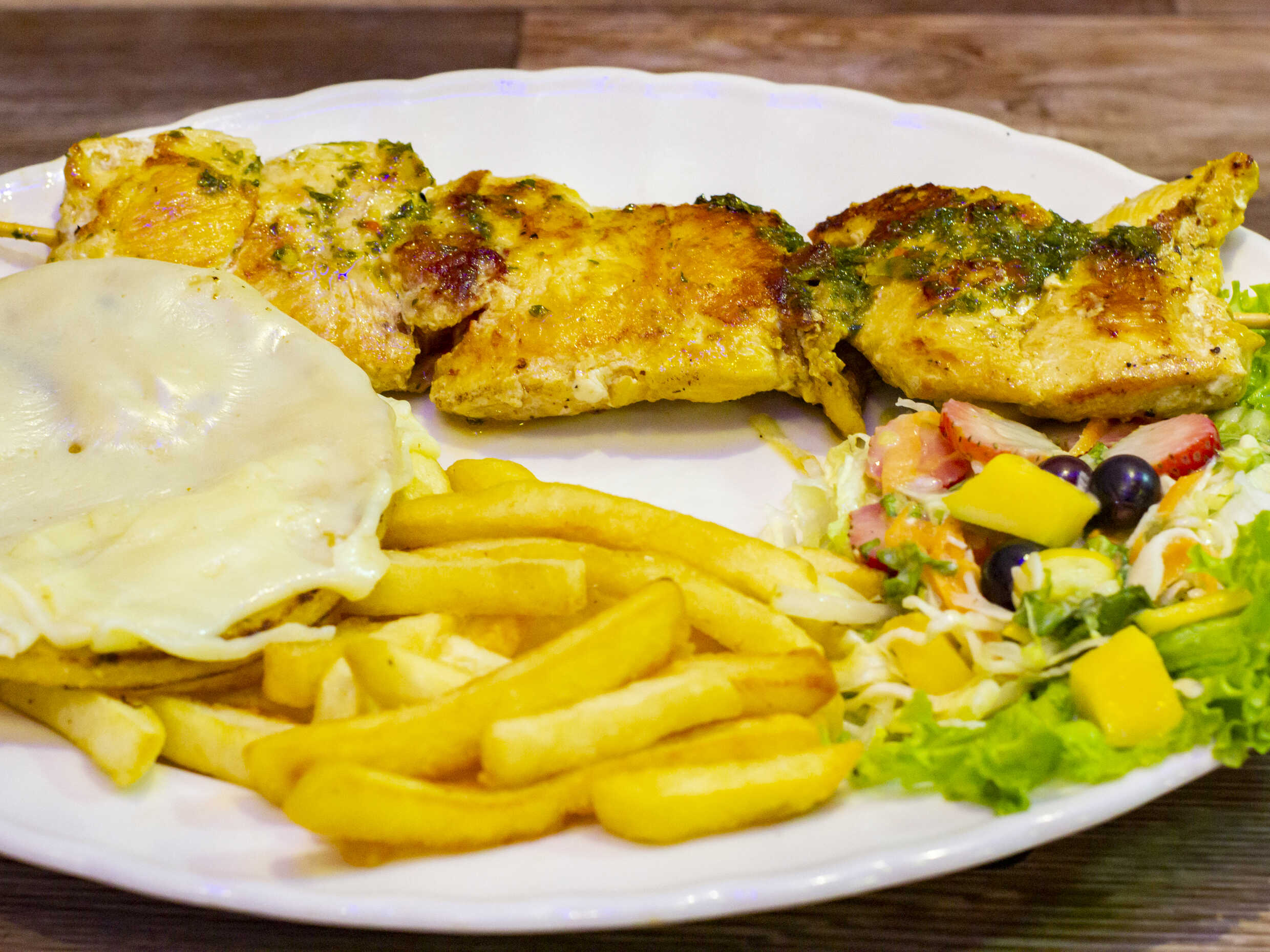 Chuzo de pollo 0 cerdo, acompañado de papas fritas, ensalada de la casa y arepa.