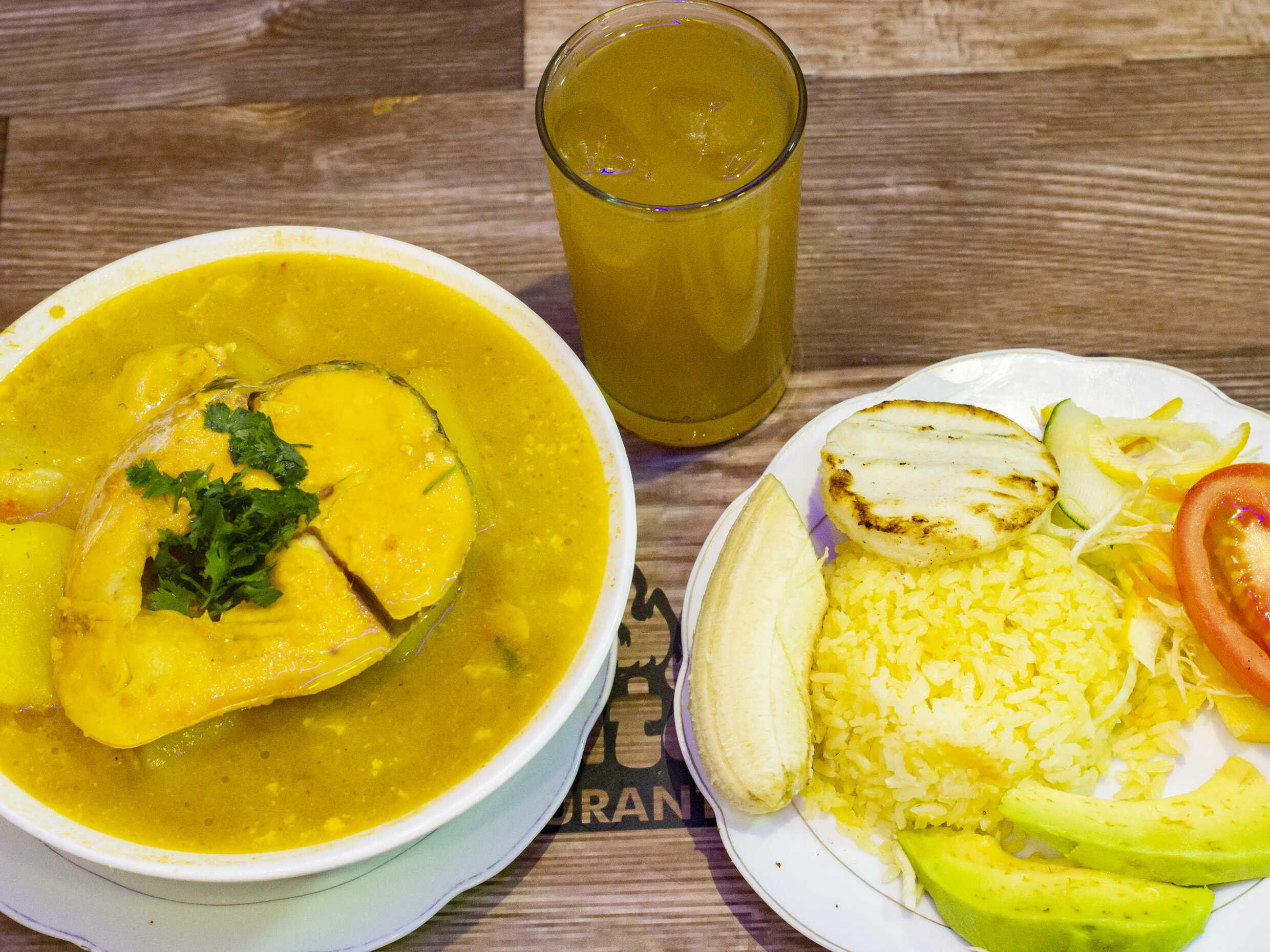 Sancocho con bagre, acompañado de arroz y ensalada de la casa.