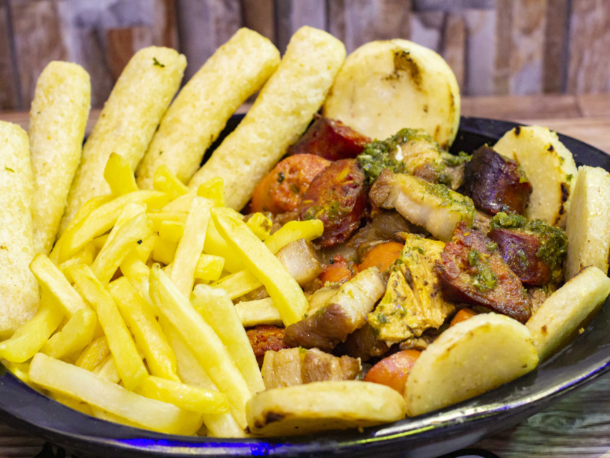 papas a la francesa, croquetas de yuca, arepa, carne de cerdo, chicharron, chorizo de cerdo, chorizo de ternera, y carne de res