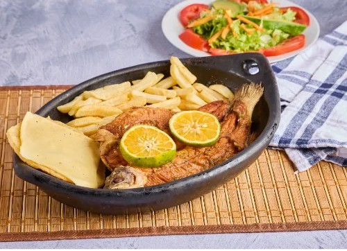 Tilapia frita, acompañada de porción de arroz, patacón y ensalada de la casa.