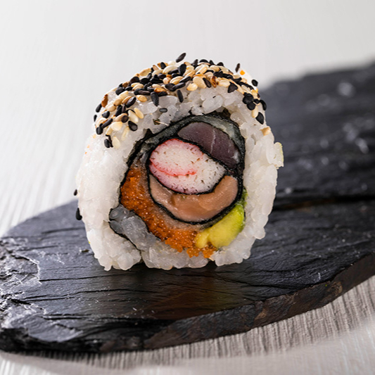 Palmito, salmón fresco, atún, aguacate, masago, topping de wakame, ajonjolí.