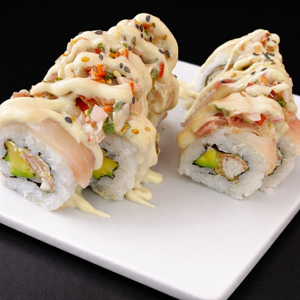 sushi.queso crema,aguacate,palmito,topping,tilapia fresca,salsa acevichada,picode gallo