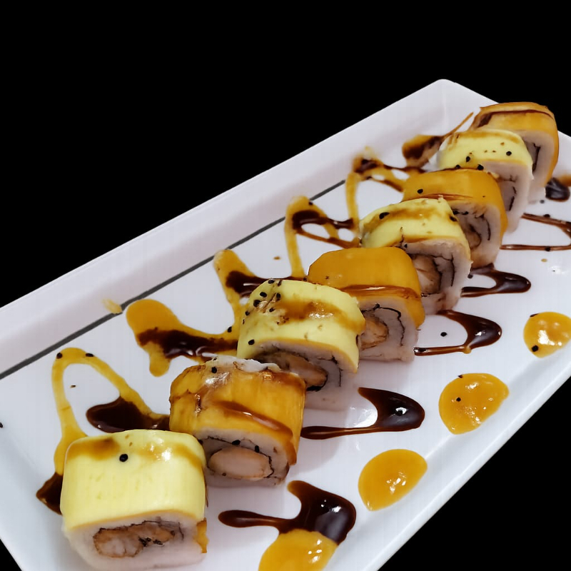 sushi,queso crema.pollo apanado,topping,platano,aguacate,salsa teriyaki,uchuva