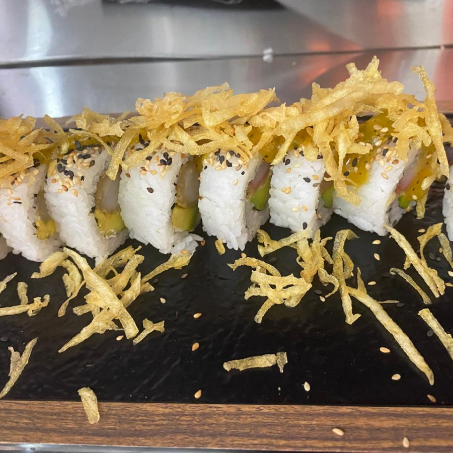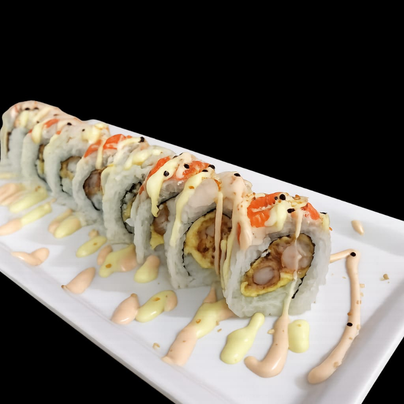 sushi apanado.queso crema, aguacate,tilapia, salsa fuyi