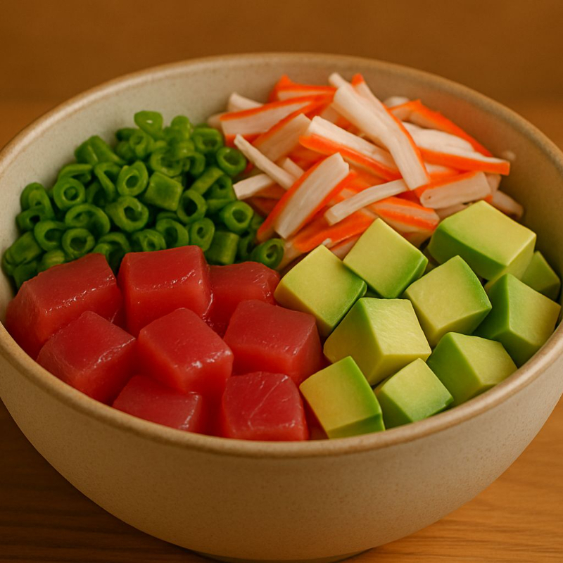 Bowl de arroz, base con atún fresco y vegetales variados.