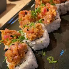 10 bocados ,sushi,queso crema,aguacate,camaron,toppimg,atun fresco,salsa ,spcy
