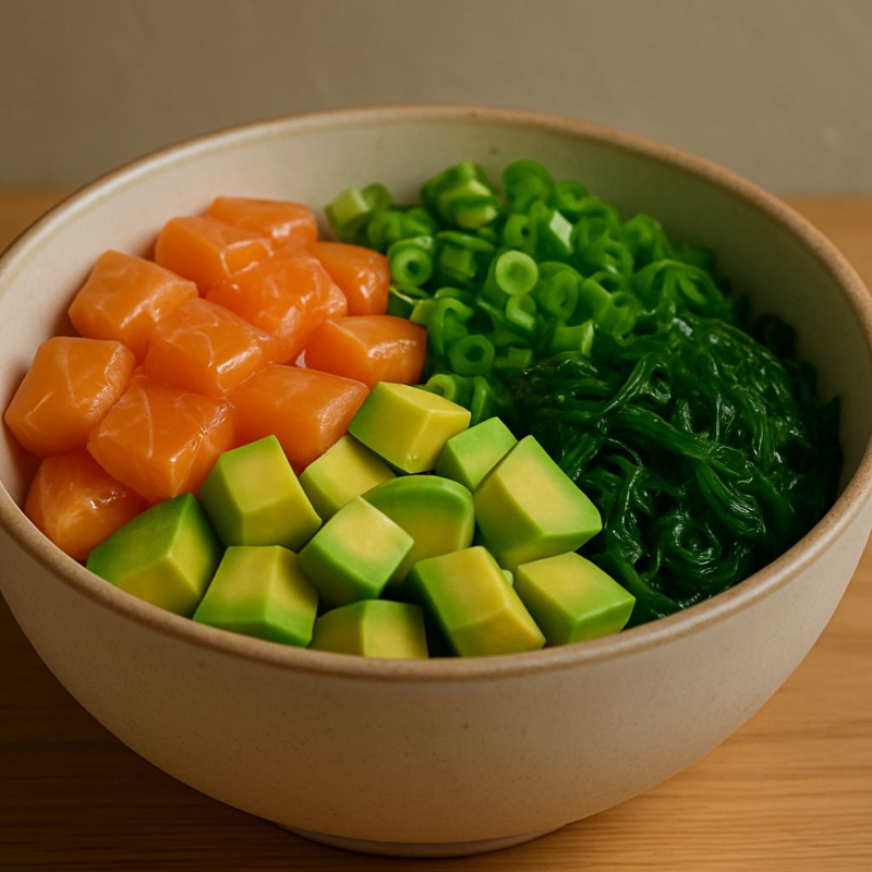 Aguacate, wukame, zanahoria, topping de salmón fresco, wukame, masago.