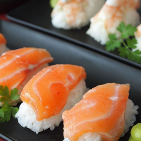 Finos cortes de salmón fresco y servidos sobre bases de arroz de sushi.