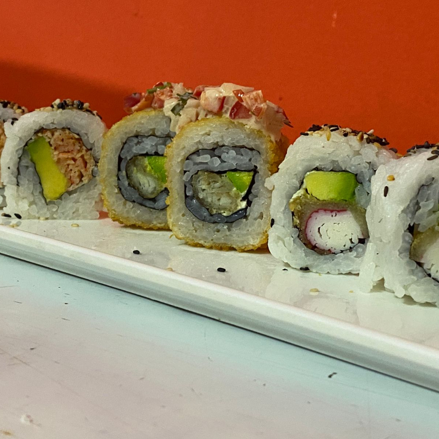 Queso crema, aguacate, kanikama, topping de salmón fresco, atún, aguacate, tilapia, salsa fuji.