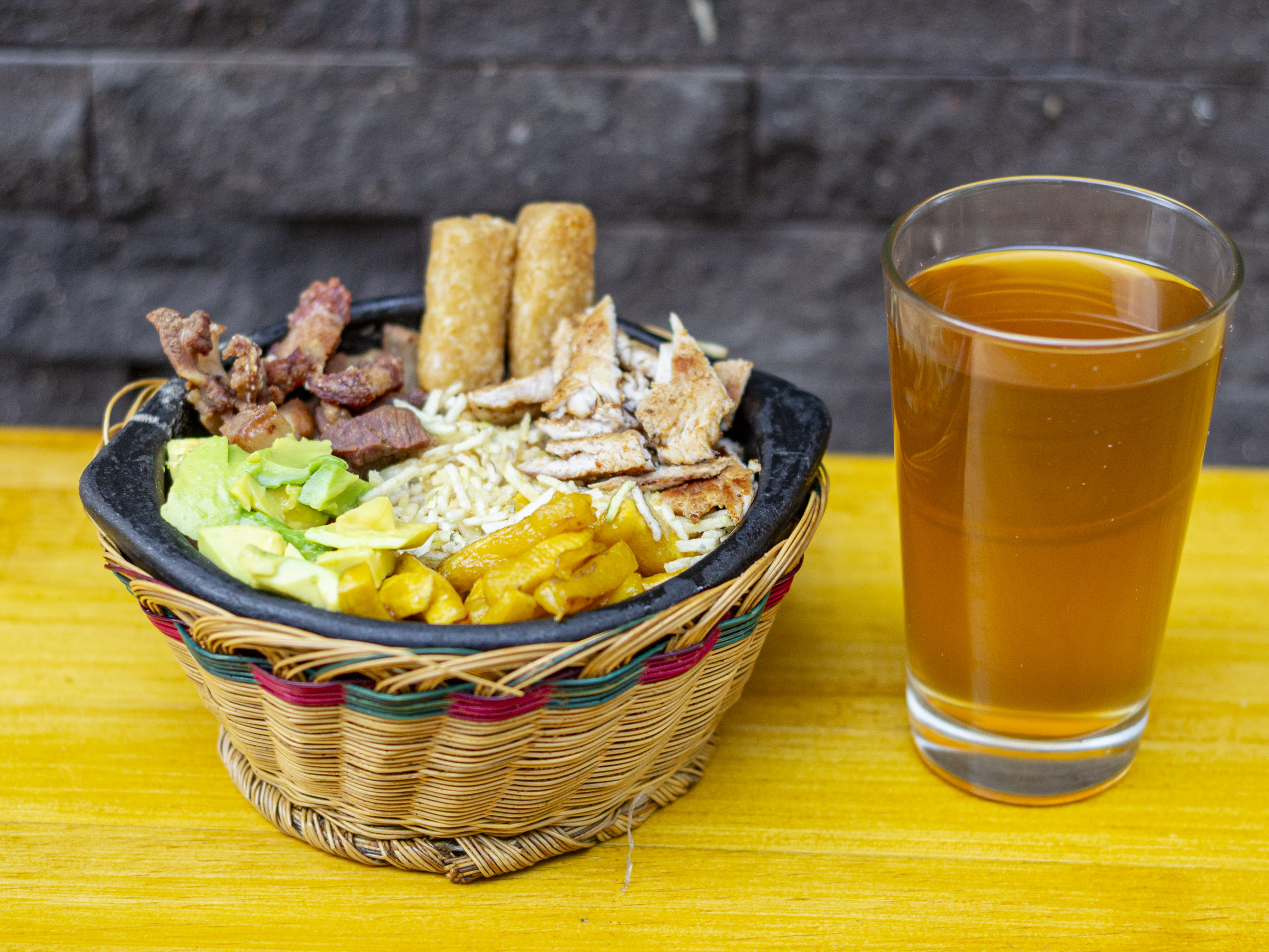 Cazuela paisa con frijoles, arroz, carne molida, chicharrón tostado, plátano maduro, chorizos, aguacate y ripio de papa, acompañado del jugo del dia..