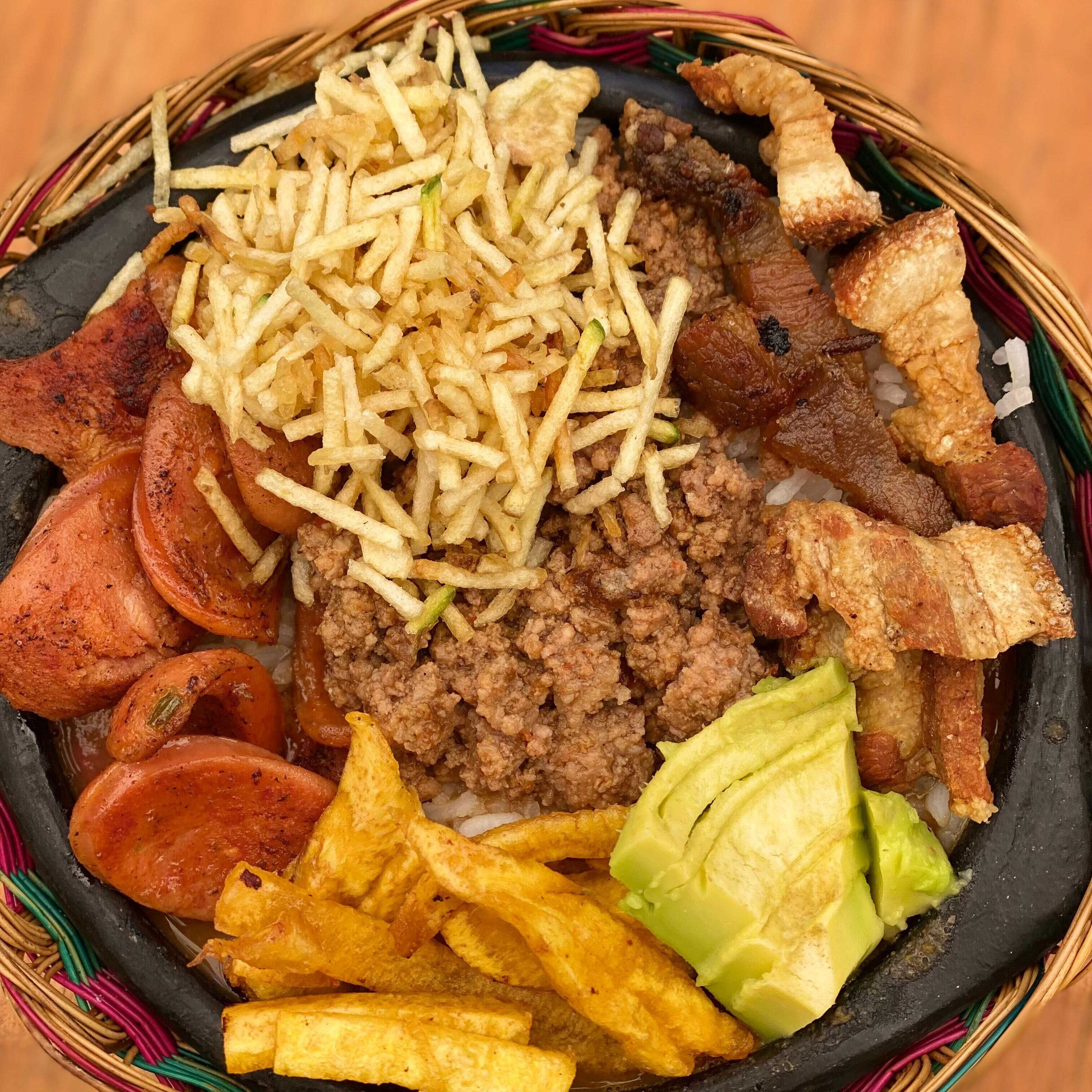 Cazuela de la abuela con frijoles, arroz, aguacate, ripio de papa, carne molida, chicharron tostado, papita criolla, hogao,