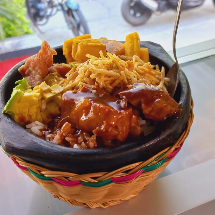 Cazuela de la Ama con frijoles, arroz, aguacate, ripio de papa, chicharron tostado, pollo desmechado, maicitos y platano maduro.