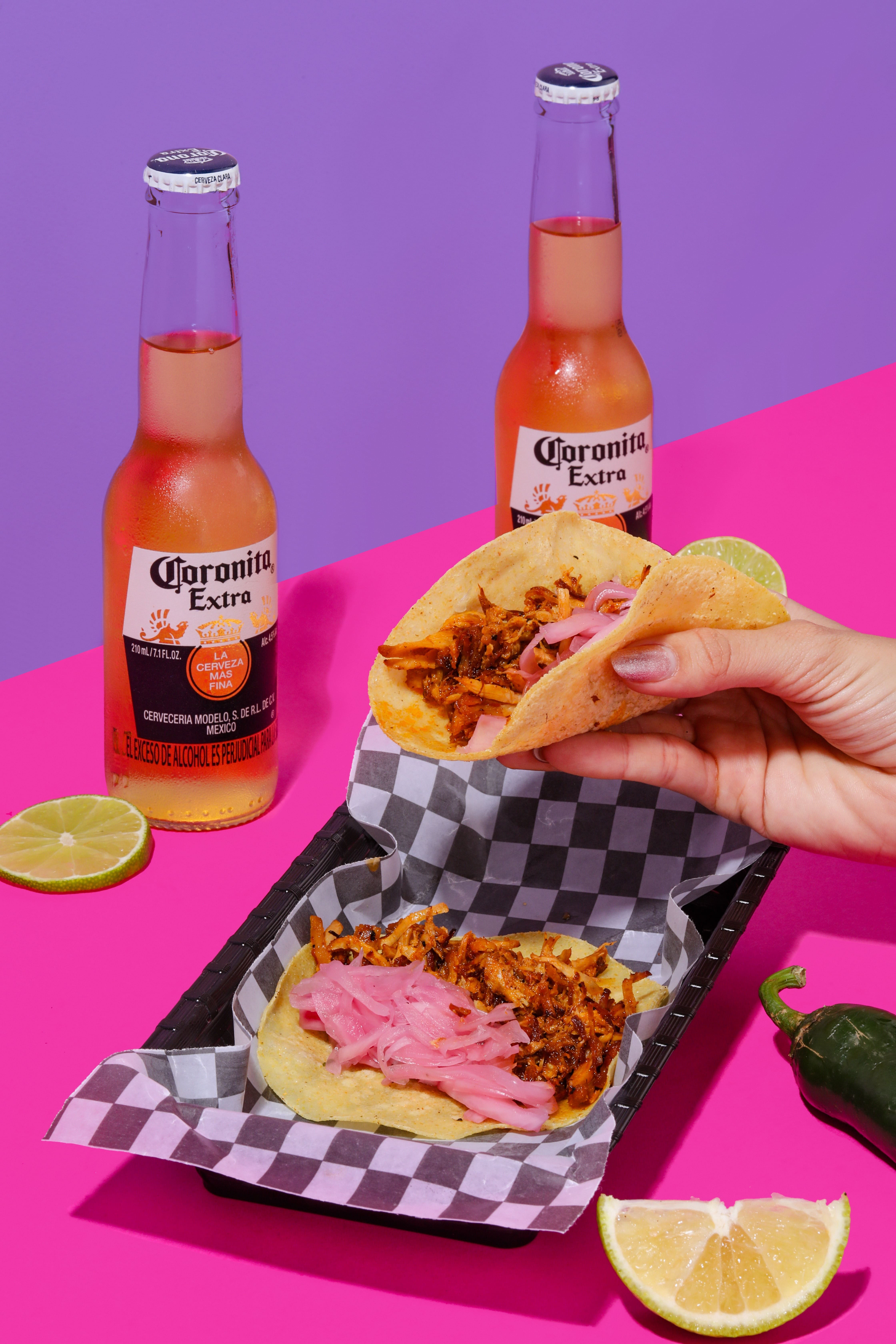 Carne de cerdo desmechada adobada en achiote y especias, acompañada de encurtido de cebolla morada.