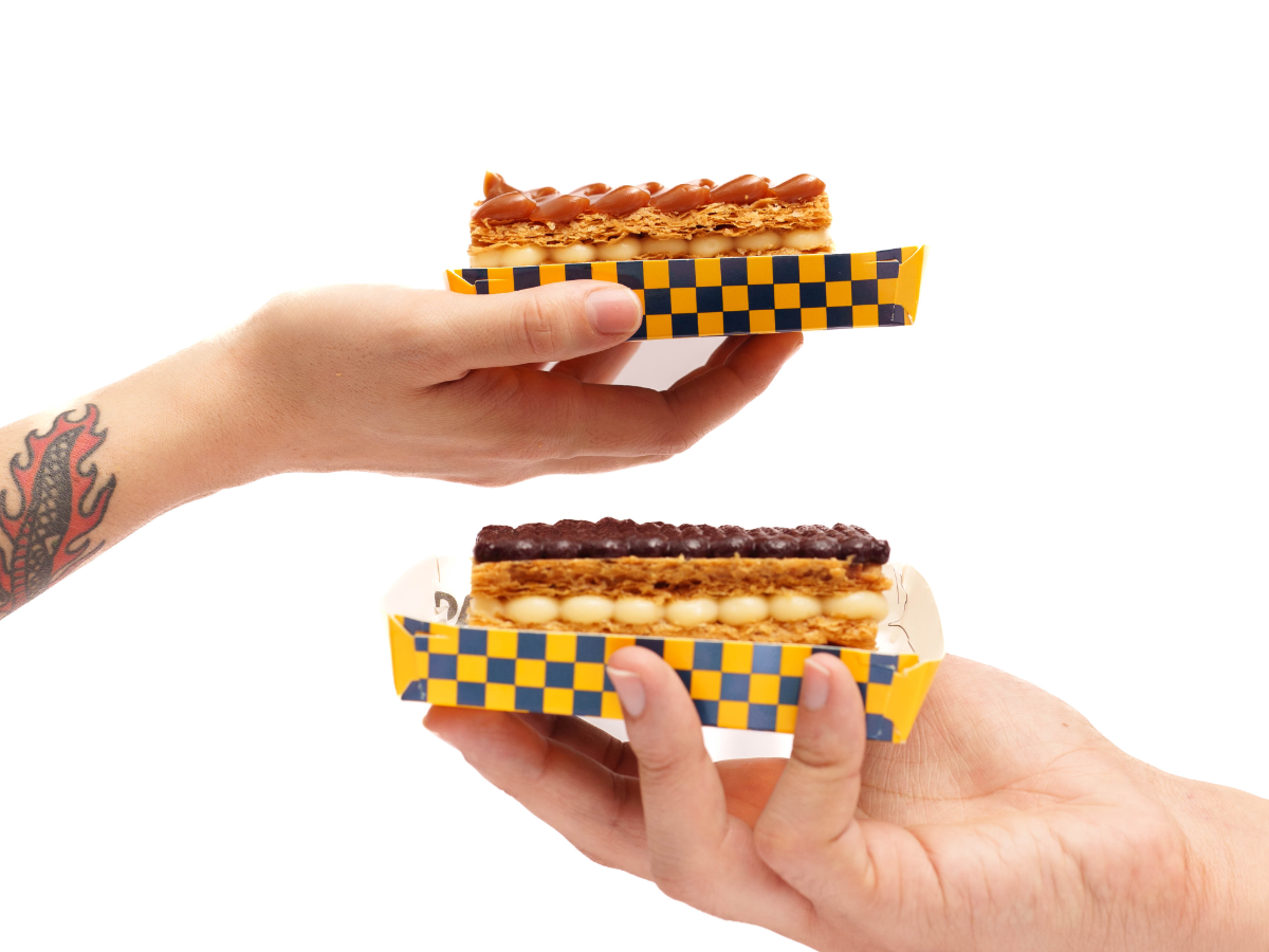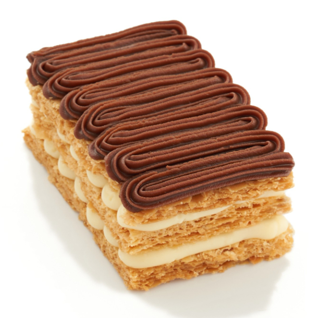 Milhoja artesanal armada al instante, de tamaño personal rellena de crema pastelera con cubierta de ganache de chocolate selva 46%