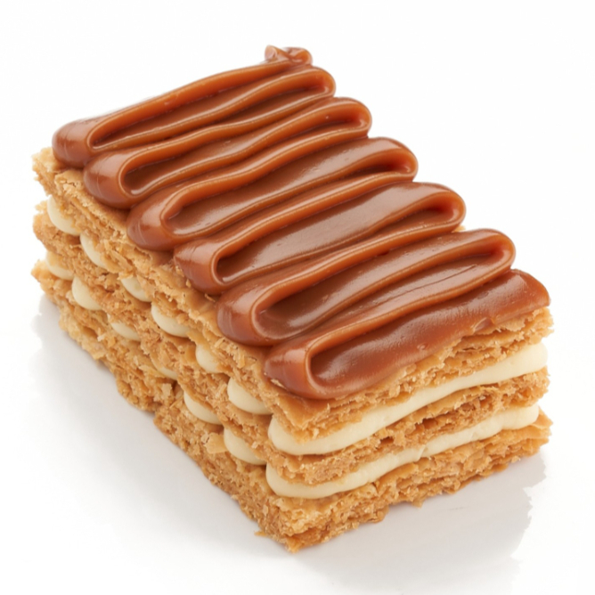 Milhoja artesanal armada al instante, de tamaño personal rellena de crema pastelera con cubierta de arequipe.