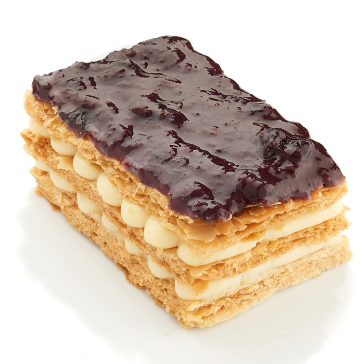 Milhoja artesanal armada al instante, de tamaño personal rellena de crema pastelera con cubierta de frutos rojos (arándanos, fresa y mora).