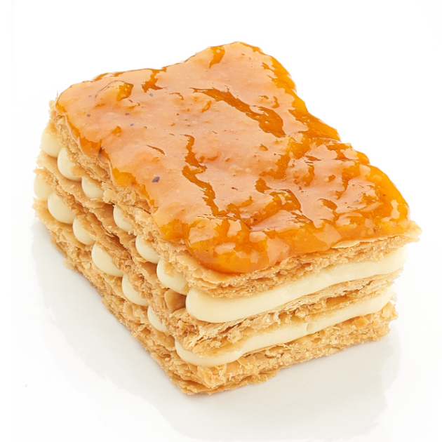Milhoja artesanal armada al instante, de tamaño personal rellena de crema pastelera con cubierta de mermelada de frutos amarillos (durazno, uchuva y maracuya).