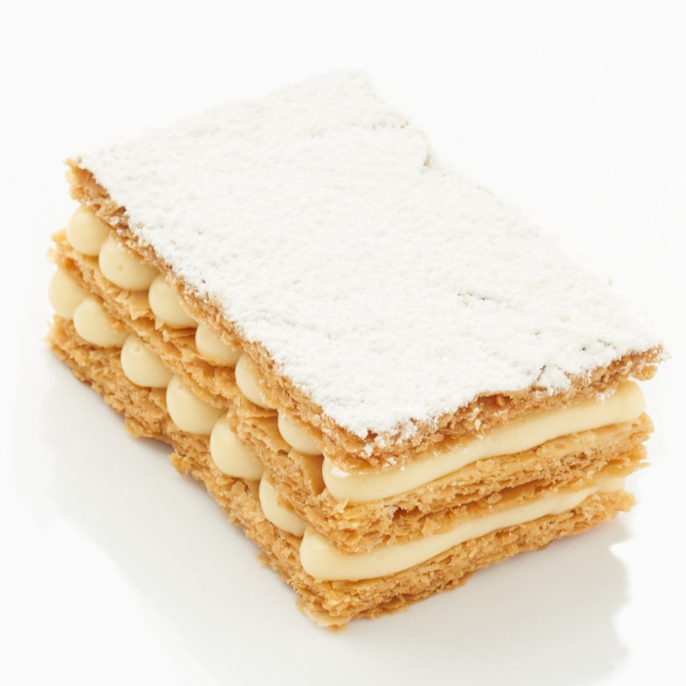 Milhoja artesanal armada al instante, de tamaño personal rellena de crema pastelera con cubierta de azúcar pulverizada.