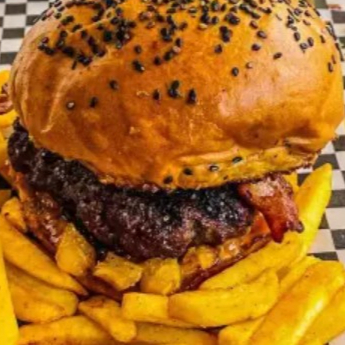 Pan brioche, 200 g de carne Angus certificada, verduras frescas, tocineta, pepinillos agridulces en trozos acompañada con papas a la francesa y salsa de la casa.
