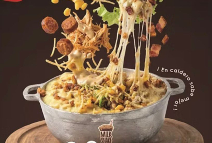 Papa a la francesa, carne desmechada, chorizo, salchicha ideal, queso, maíz, guacamole.