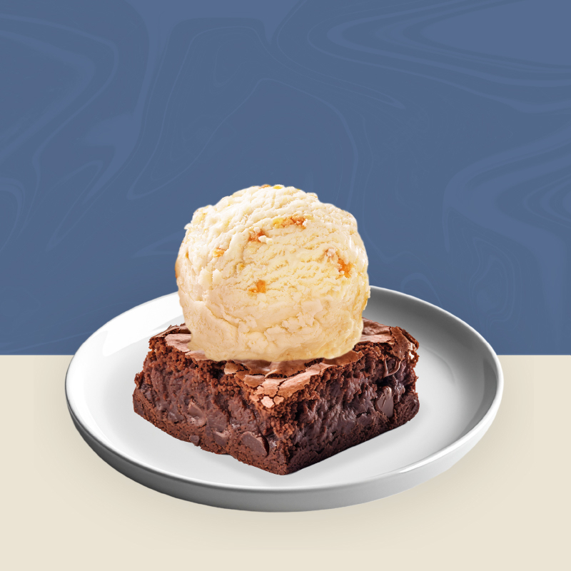 Brownie con helado sabor Yogurt con maní y caramel